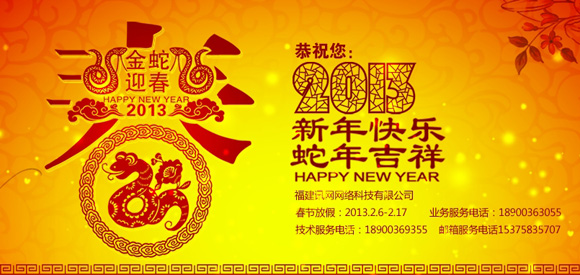 歲月如梭,一年一度的春節長假又將來臨,值此新春佳節之際,福建訊網全體員工衷心感謝您在過去一年里對訊網的支持和信任,提前給各位新老朋友拜年,恭祝大家生意興隆、事業大吉、闔家歡樂,蛇年吉祥!