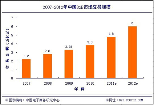 據中國電子商務研究中心監測顯示:2010年我國B2B電子商務成交額達3.8萬億,中小企業利用電子商務達成交易的規模逐年增長,從2007年至2009年分別達到2.2萬億、2.8萬億、3.28萬億元人民幣;對此,我們預計:2011和2012年的電子商務成交額分別可為4.8萬億和6萬億元人民幣。